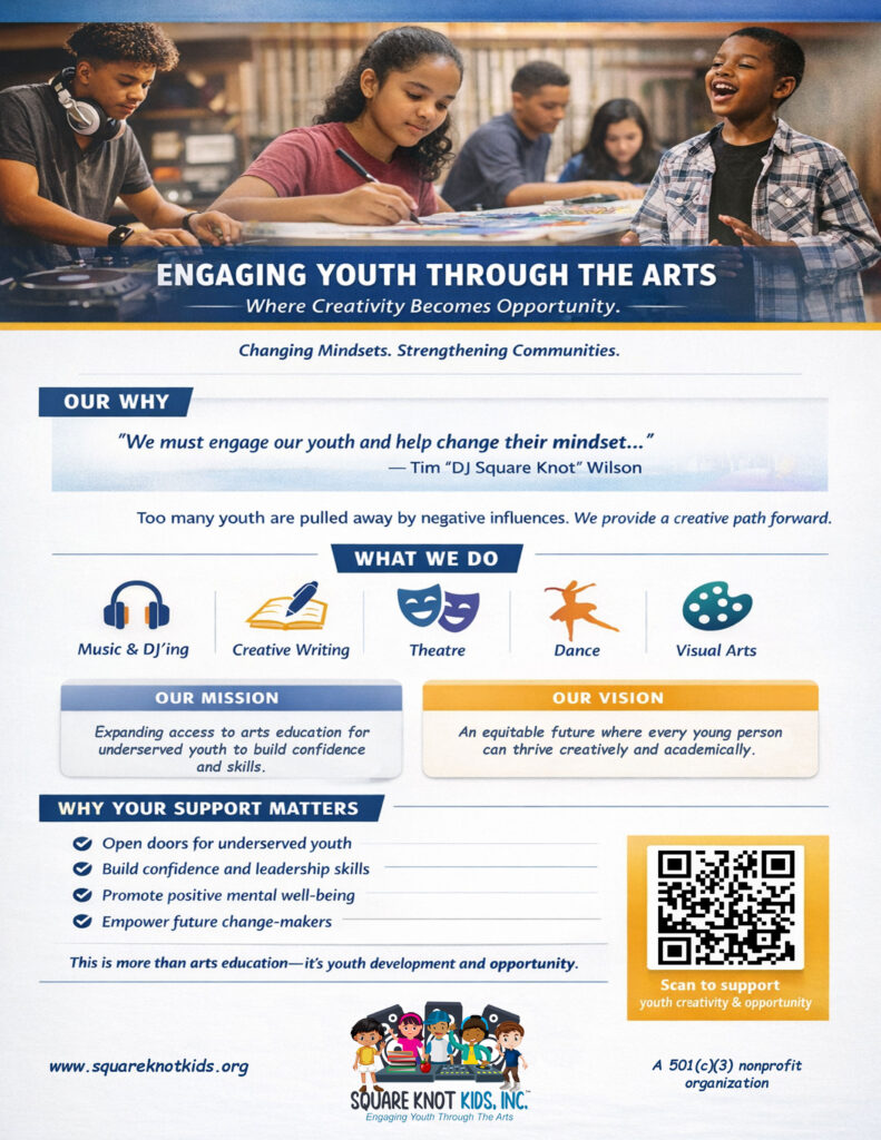 We believe creativity is not a luxury, it is a lifeline. Through intentional exposure to the arts including music and DJ’ing, creative writing, theatre, dance, chorus, poetry, and visual and performing arts, Square Knot Kids engages youth in ways that build confidence, leadership, social connection, and positive life skills while supporting mental well-being. These programs do more than teach artistic techniques; they create pathways for young people to see themselves differently, believe in their own voice, and imagine a future beyond their current circumstances. With the support of parents, educators, community leaders, and funders, Square Knot Kids helps youth carry what they learn into their homes, schools, and neighborhoods, empowering them to become change agents whose creativity, leadership, and service positively impact everyone they reach.